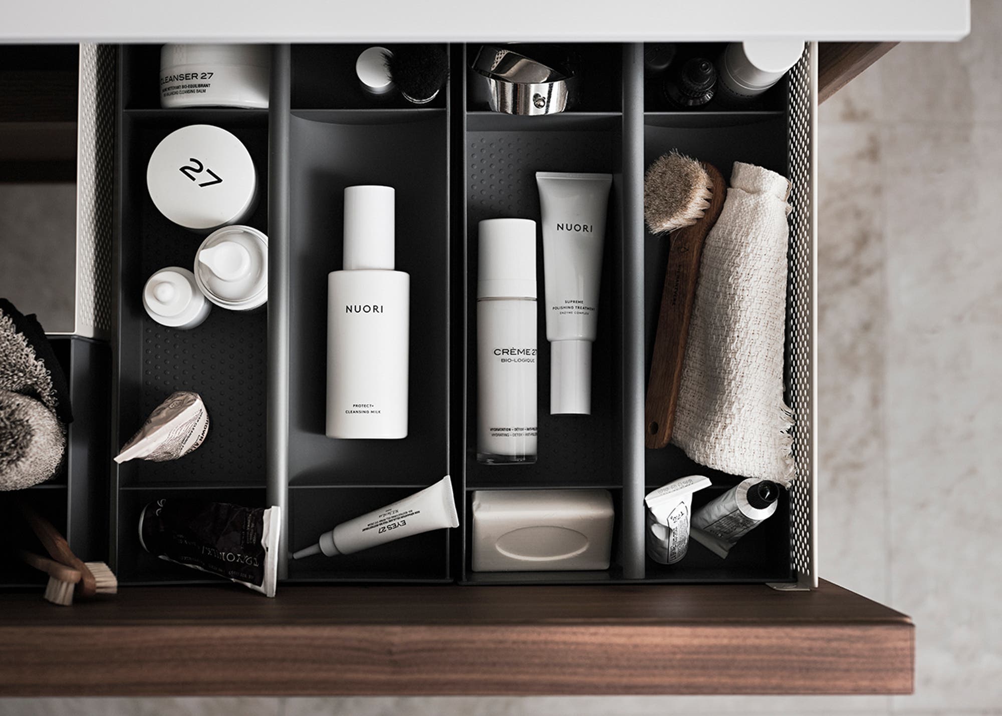 Haven's unique box construction in light metal with removable interior (Toolbox) gives you more space and better order in the bathroom cabinet. The perforated material lets the light in and gives an elegant impression, which is also easy to keep clean.