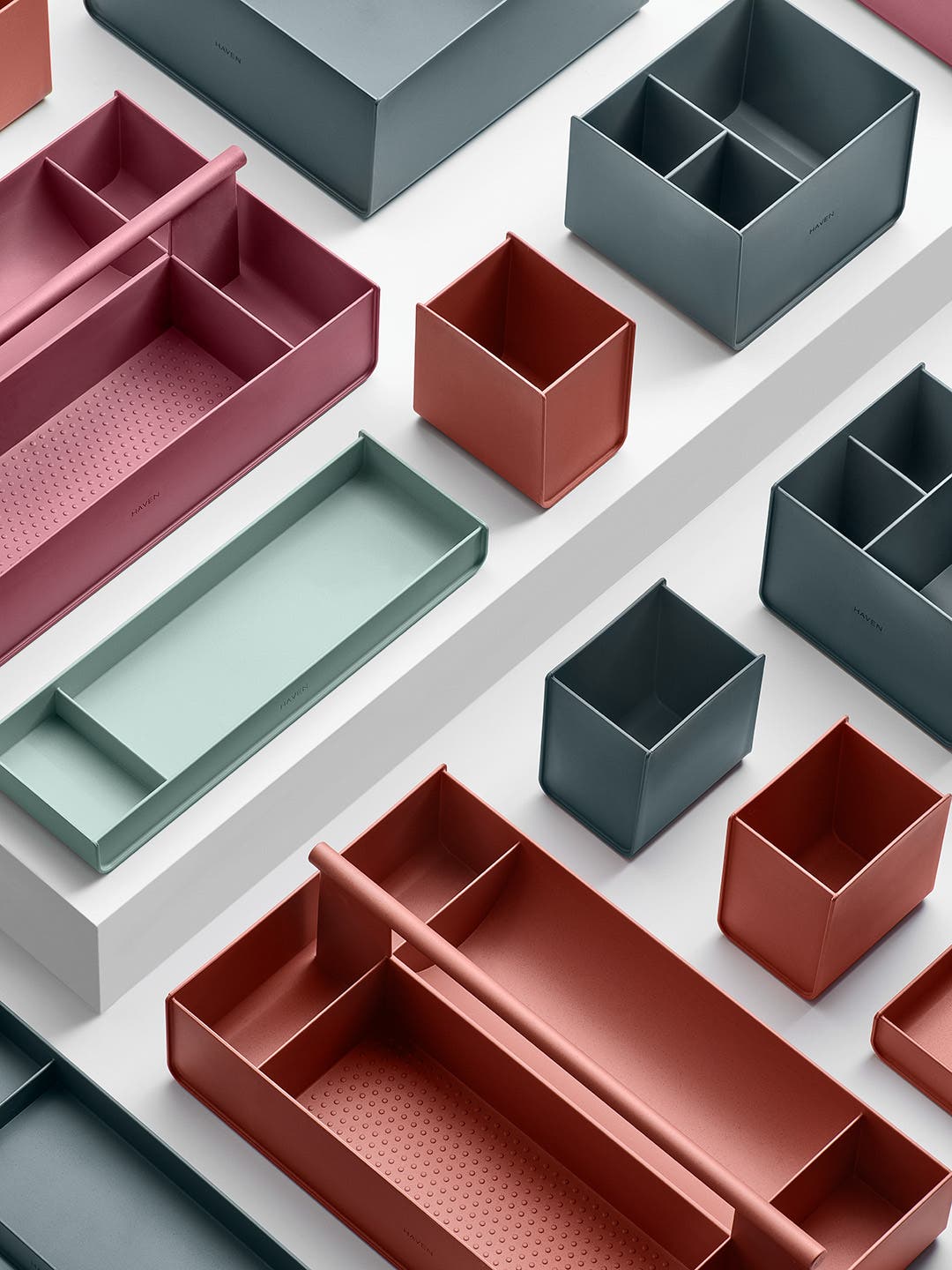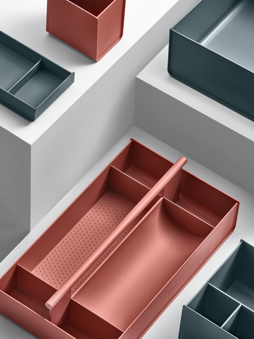 Our lightweight and stable metal drawer construction is lacquered in a matching color and the smart removable drawer inserts are available in a number of complementary colors that can be mixed for a personal combination. They are made of a durable natural material consisting of vegetable starch reinforced with bamboo fibers. This means that the box is biodegradable once it has served its purpose.